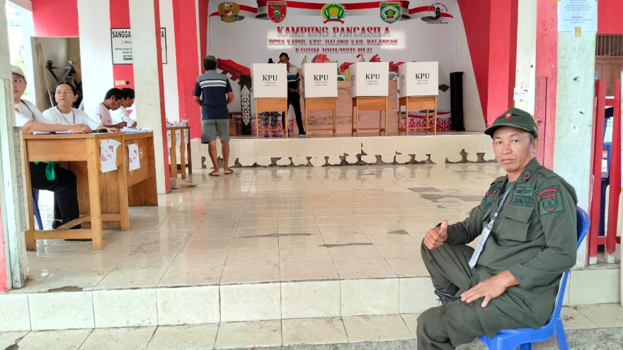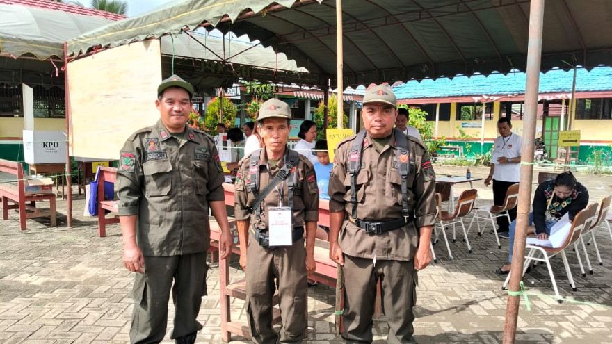 SATLINMAS Bertugas di Lokasi Pemilu Bupati dan Gubernur di Desa Kapul, Kecamatan Halong, Kabupaten Balangan, Kalimantan Selatan