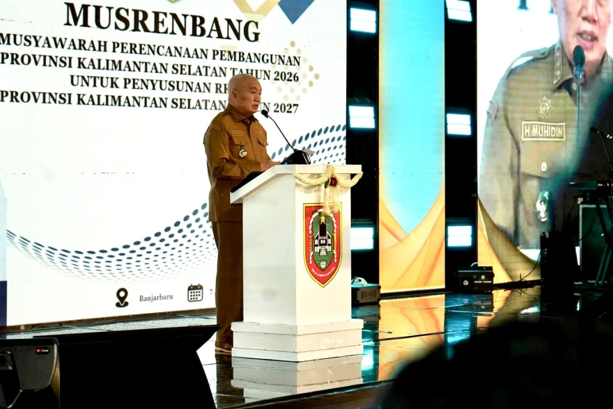 Banjarbaru – Gubernur Kalimantan Selatan H. Muhidin memaparkan arah pembangunan daerah dalam Musyawarah Perencanaan Pembangunan (Musrenbang) 2026 untuk penyusunan Rencana Kerja Pemerintah Daerah (RKPD) 2027 Provinsi Kalimantan Selatan yang digelar di Banjarbaru, Selasa (7/4/2026). Forum ini menjadi ruang strategis untuk menyelaraskan program pembangunan provinsi dengan kabupaten/kota serta pemangku kepentingan lainnya.